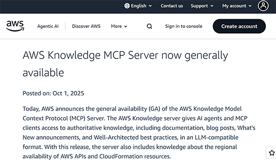 • AWSのナレッジを生成AIで参照できる「AWS Knowledge MCP Server」正式版が登場。公式のドキュメントやAPIリファレンス、アーキテクチャガイダンスなど情報源に - Publickey