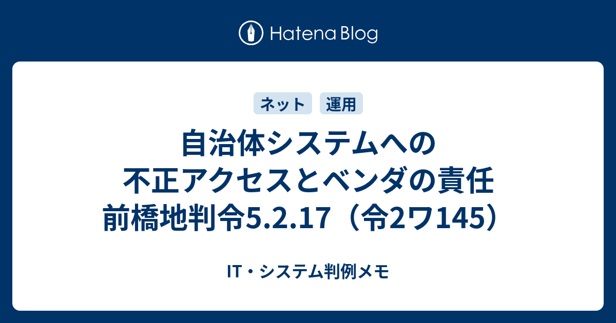- 自治体システムへの不正アクセスとベンダの責任 前橋地判令5.2.17(令2ワ145) - IT・システム判例メモ