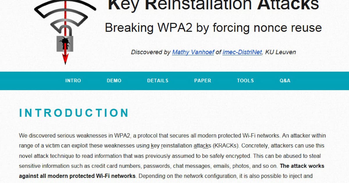 - Wi-Fi認証のWPA2に複数の脆弱性? 研究者が公表を予告 (ZDNet Japan)